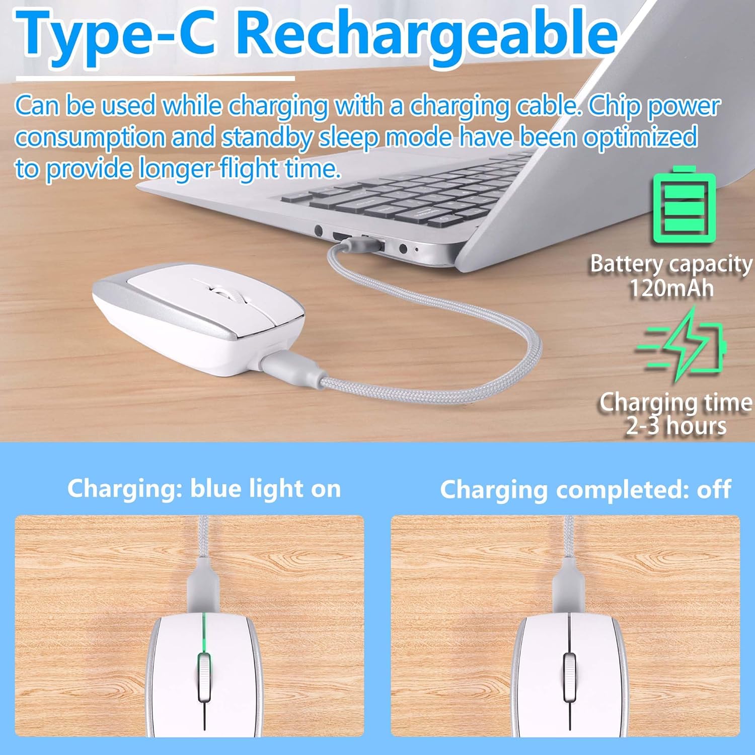 Rechargeable: This mini computer mouse has a built-in 120mAh rechargeable battery, and Type-C charging ensures fast charging (2-3 hours). It can be charged using a Type-C charging cable without the need to purchase additional batteries. This small wireless mouse also has a standby sleep function to maximize the life of the mouse, and this rechargeable mouse can provide long-lasting power for PC or laptop.