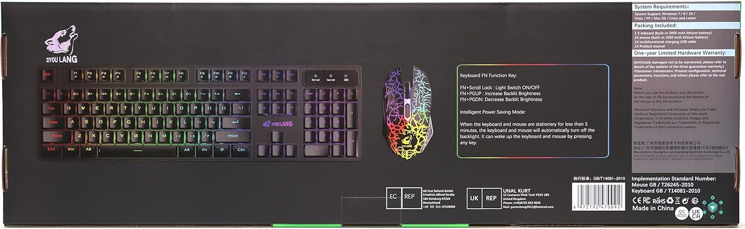 I’ve been wanting one of these since I was a kid, now I can finally afford one, and for me works fine, I’ve been using it for about 3 months now, the delivery took a few weeks, but it was worth the wait.It arrived very well packed and well padded so it doesn’t become damaged.The keys are bit clacky, they have that sound, but it doesn’t bother me that much. The set came charged, I didn’t have to charge the mouse for 3 days of use until the battery died mid match xD, I then discovered it has a charging port at the front of it, can’t believe I spent a week almost and haven’t noticed it. I find that amusing. They mouse has a very nice almost like a heart beat color change to it, it might look to you as the color is lagging but no that is just the effect. The keyboard colors can’t change color it is just set to rainbow, but it looks nice having all of the colors on it. The keys are a bit mixed up the @ symbol is at the top instead of the bottom which is fine as I am now aware of it.It also comes with 1 charging cable.After a while of using I’ve noticed that the keys begin to fade just a small bit, I am planning to touch it up with a bit of paint, but other than that it is fine. I really like it, The scroll lock is apparently a battery indicator, when it begins to flash it means the battery is running low, and it is also how you can turn off the the light on the keyboard.But i recommend this to anyone who is either looking for a christmas or birthday gift for their kid or who is a a gamer but wants to step up their game a small bit. Or someone like me who just wants the nice aesthetic and wants to see the keys at night when working xD.Amazing product!