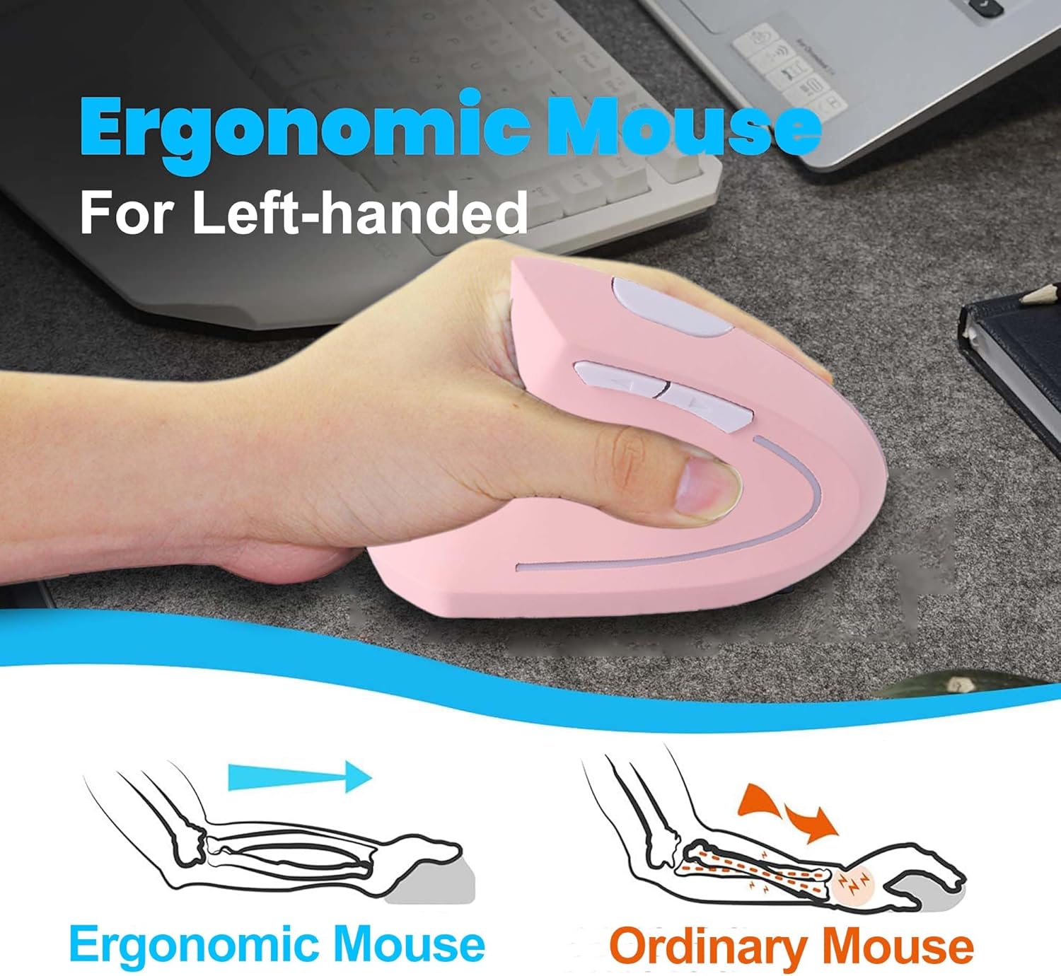Unique Vertical Mouse: Designed for left-handed users, this pink ergonomically designed vertical mouse offers natural wrist positioning for unparalleled comfort. This pink ergonomic mouse has a soft, comfortable touch that conforms to your hand, and its unique vertical shape effectively reduces arm muscle tension, perfectly accommodating a variety of hand shapes and sizes to reduce arm and wrist pain.