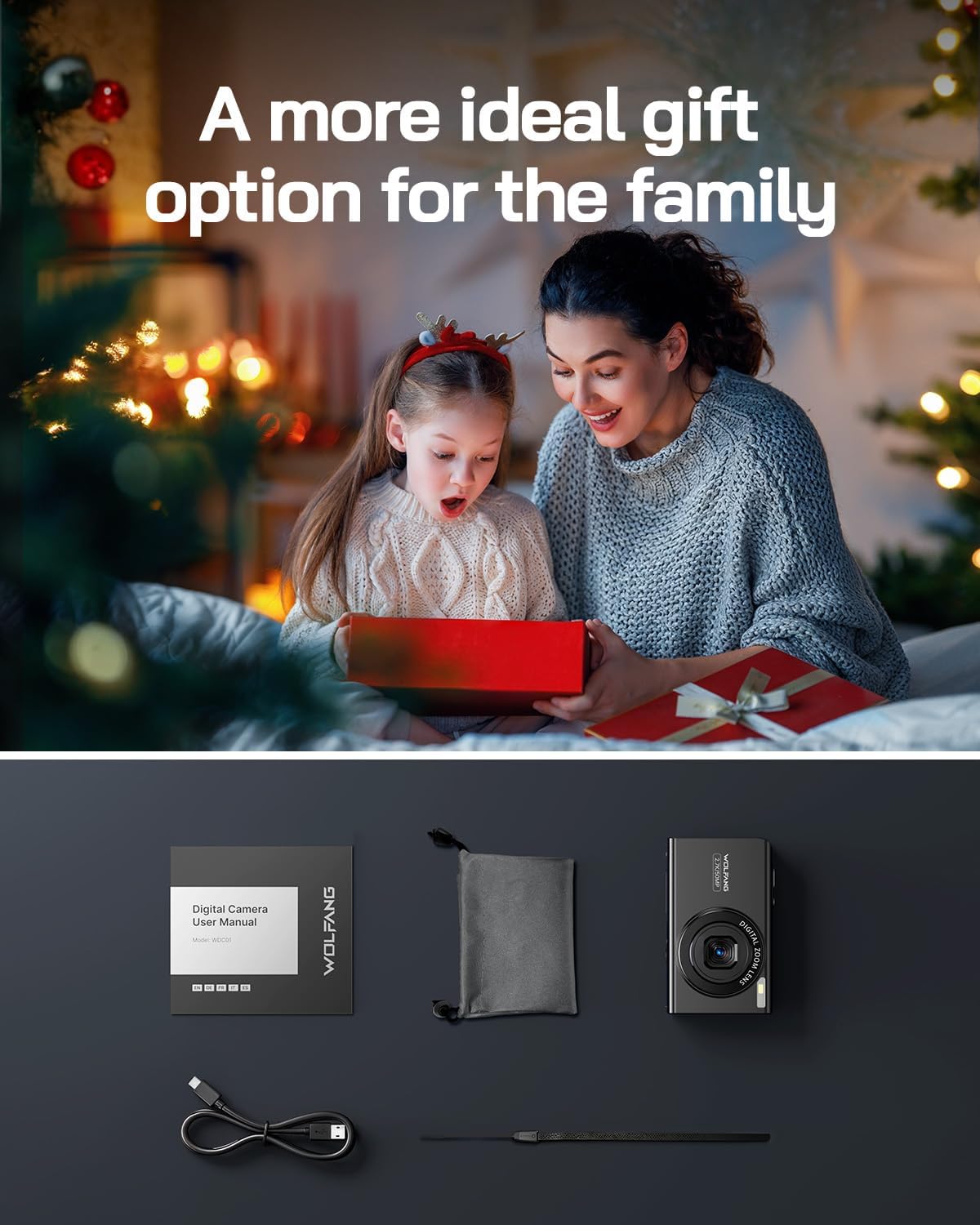 WOLFANG Digital Camera, 2.7K Kids Camera for Photography, 50MP Compact Vlogging, 16X Digital Zoom, Auto Focus Point and Shoot, Gift for Students Teens