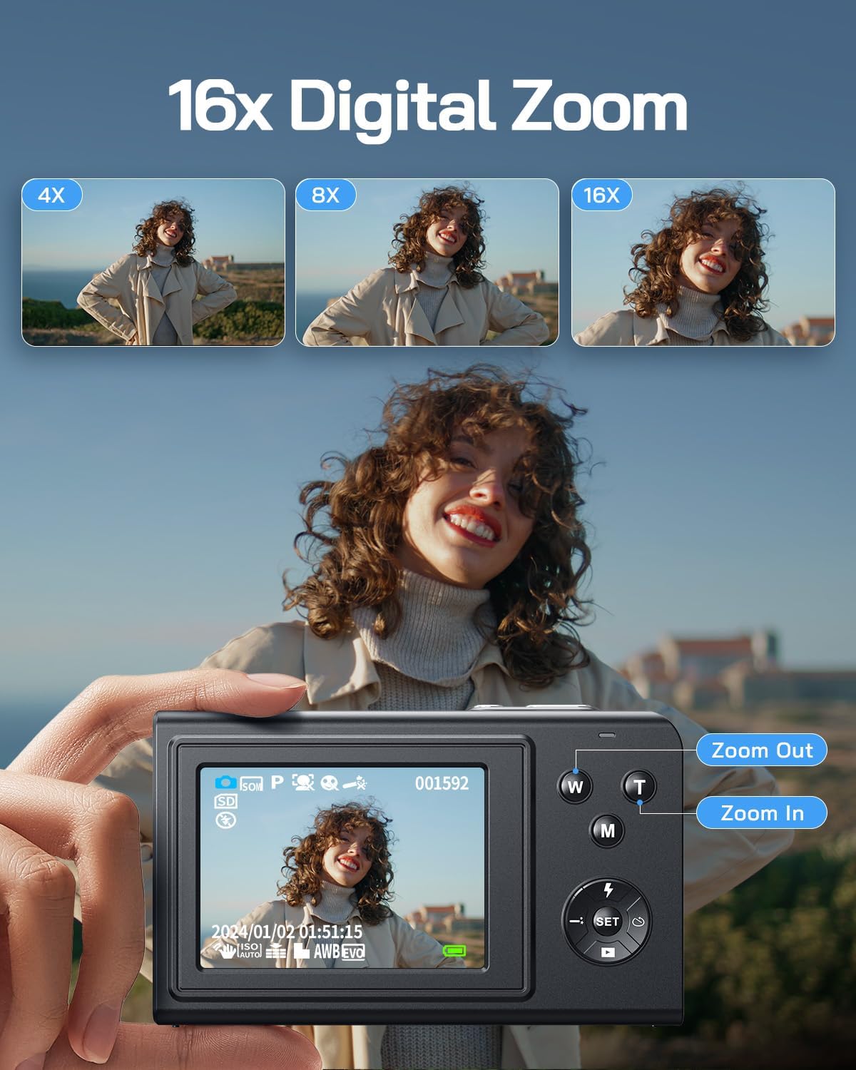 13 reviews for WOLFANG Digital Camera, 2.7K Kids Camera for Photography, 50MP Compact Vlogging, 16X Digital Zoom, Auto Focus Point and Shoot, Gift for Students Teens