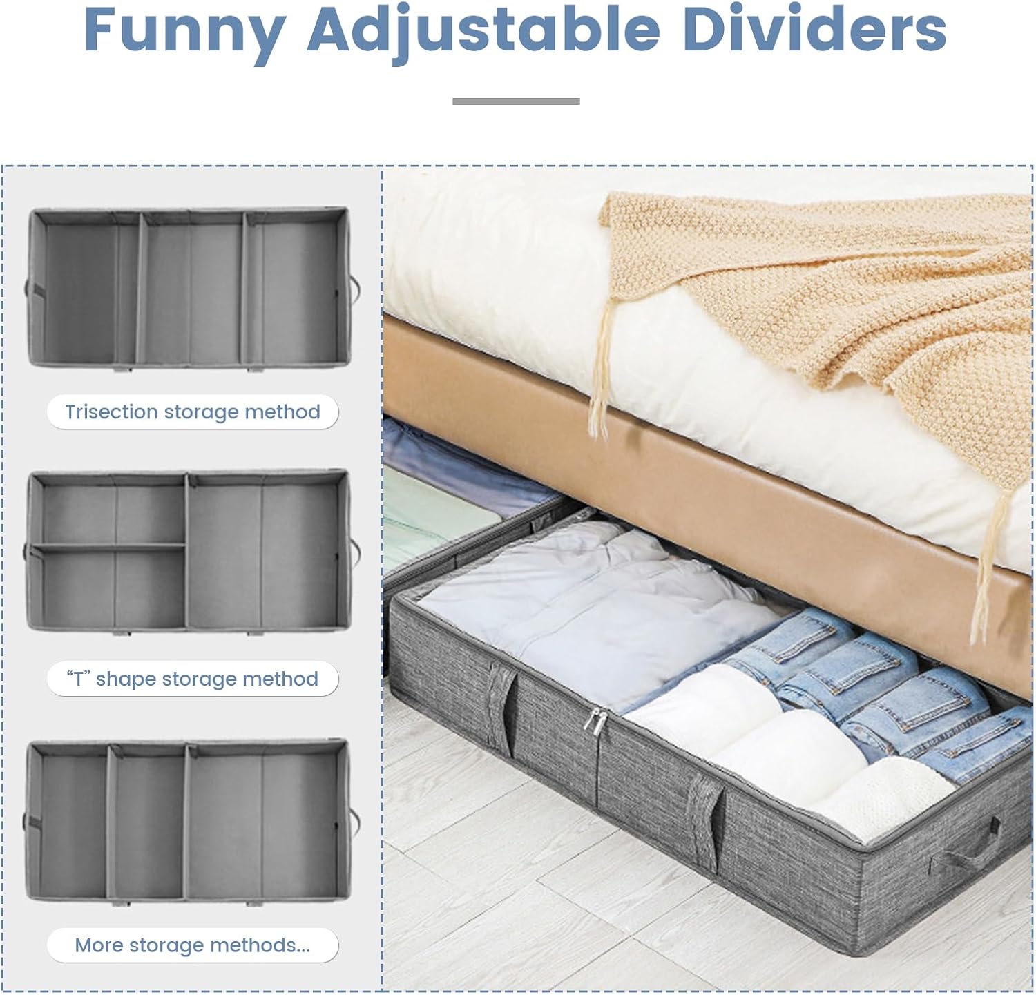 【50L Capacity with Adjustable Dividers】Each under bed storage boxes is 50L, 81x41x15cm(31.9 x 16.1 x 5.9 in). These clothes storage bags it’s big enough to store quilts, linens, sheets, comforters, blankets, pillows, off-season clothes, and toys, etc. Besides, there are 2 adjustable dividers with velcro, you can freely match a variety of storage methods, which is more flexible, practical and adds a lot of fun.