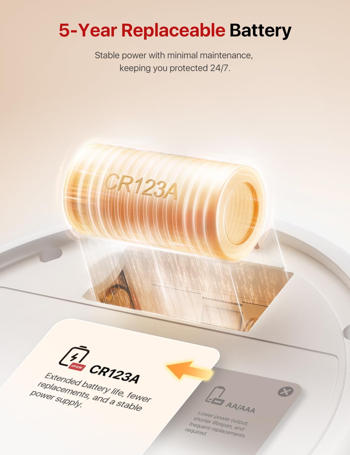 Long Lifespan & Extended Battery Life: Designed for a 10-year service life, this smoke alarm offers long-lasting, reliable protection; the replaceable CR123A battery lasts up to 5 years with weekly self-checks, ensuring long-term safety