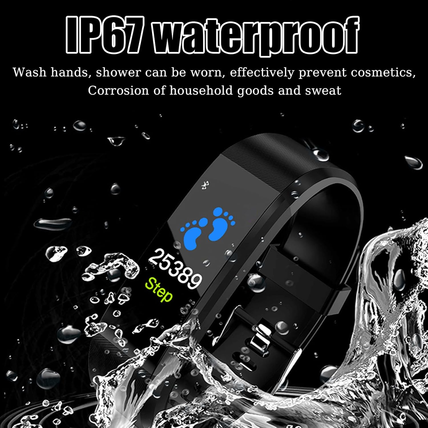 【IP67 Waterproof & Durable】This fitness watch is designed with IP67 waterproof protection, allowing you to wear it while washing hands or showering. It resists daily corrosion from cosmetics, household items, and sweat.