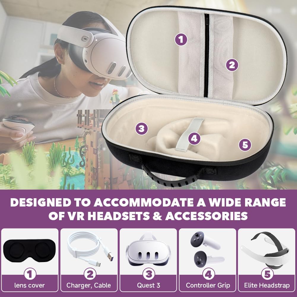 【Reasonable moulding】 – Inside the hard carrying case, there are slots for the headset, handle, and mesh pockets to keep cables, chargers, and other accessories separate from the meta quest device, preventing friction and scratches.