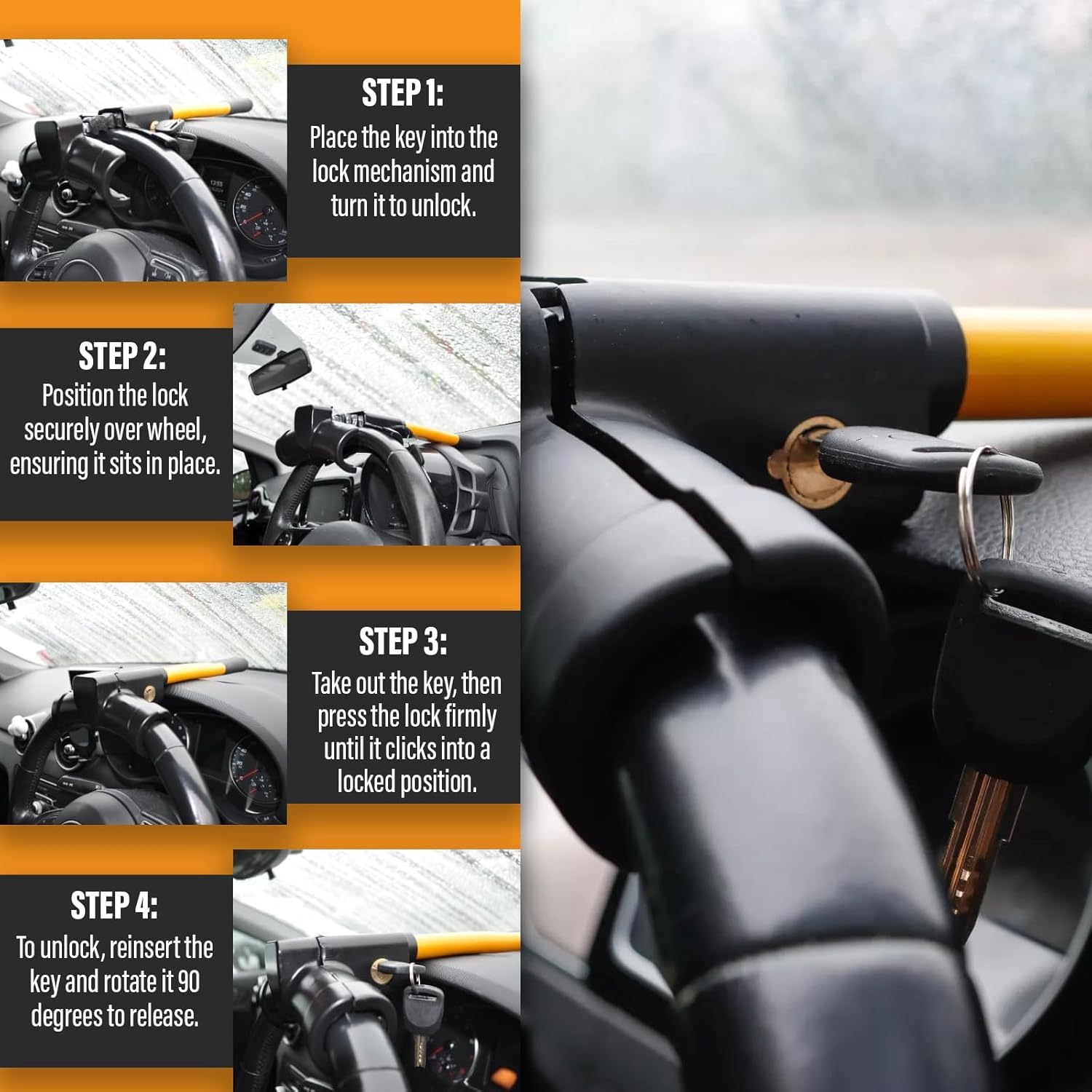 Position the lock securely over the steering wheel. Ensuring it sits in place.