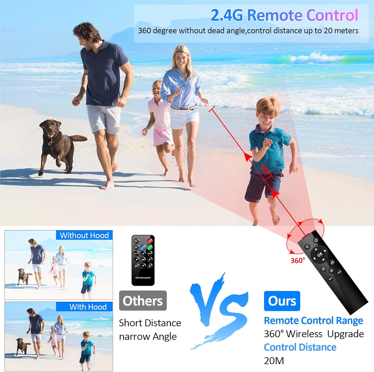 ♛【With Microphone & Lens Hood】The sound positioning of this camcorder with microphone is clear and stable. The built-in low-cut filter switch effectively reduces environmental interference and low-frequency noise. X-Y stereo sound pickup technology which makes the sound positioning clear. And the lens hood prevents stray light hitting the lens, improving image clarity and color reproduction. It comes with a 2.4G remote control which can control the camcorder wirelessly 360°from up to 20 meters!