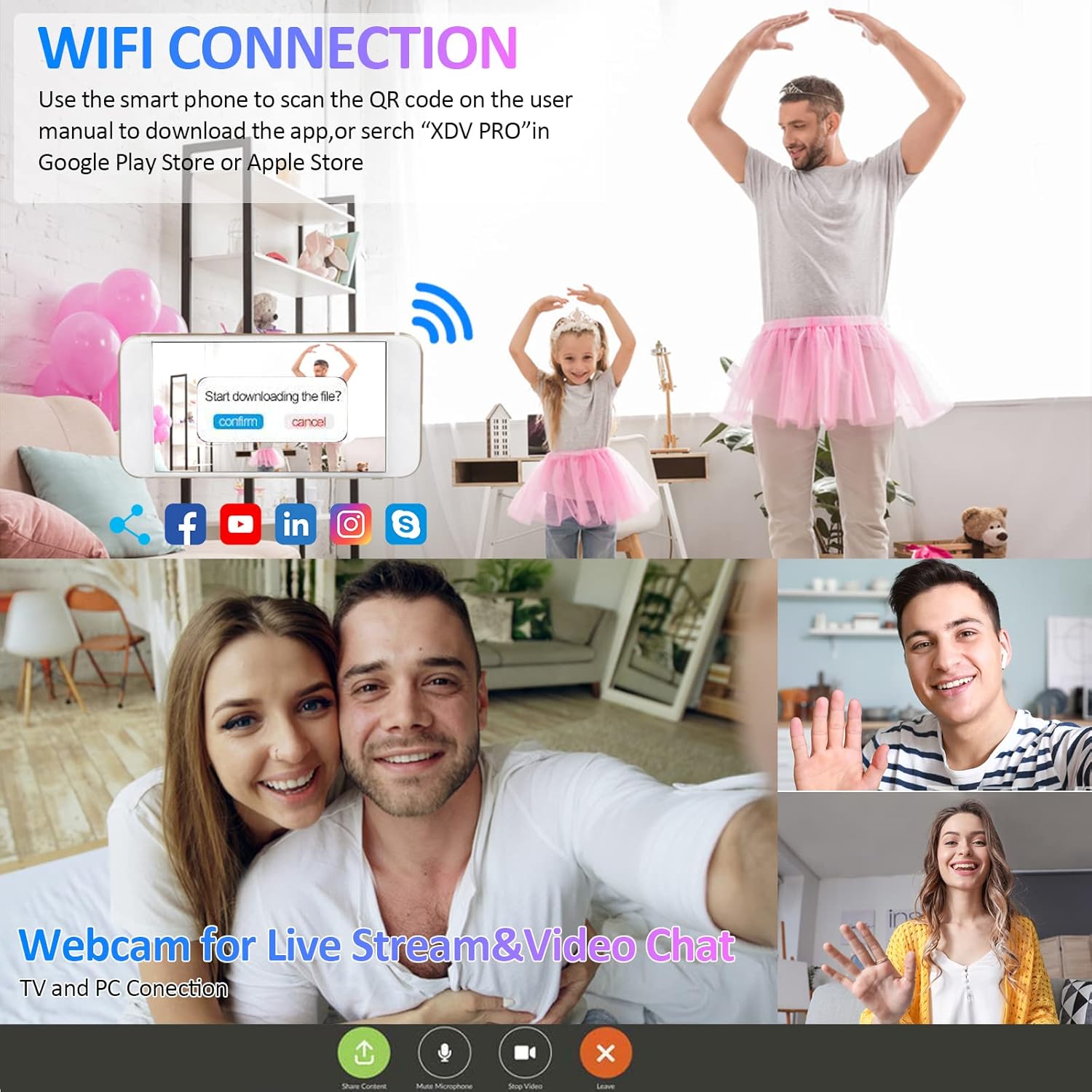 Download the APP named “XDV PRO” on your smart phone and connect the camcorder’s WIFI for preview and operation on the phone/tablet. You can share your favorite photos to social media.