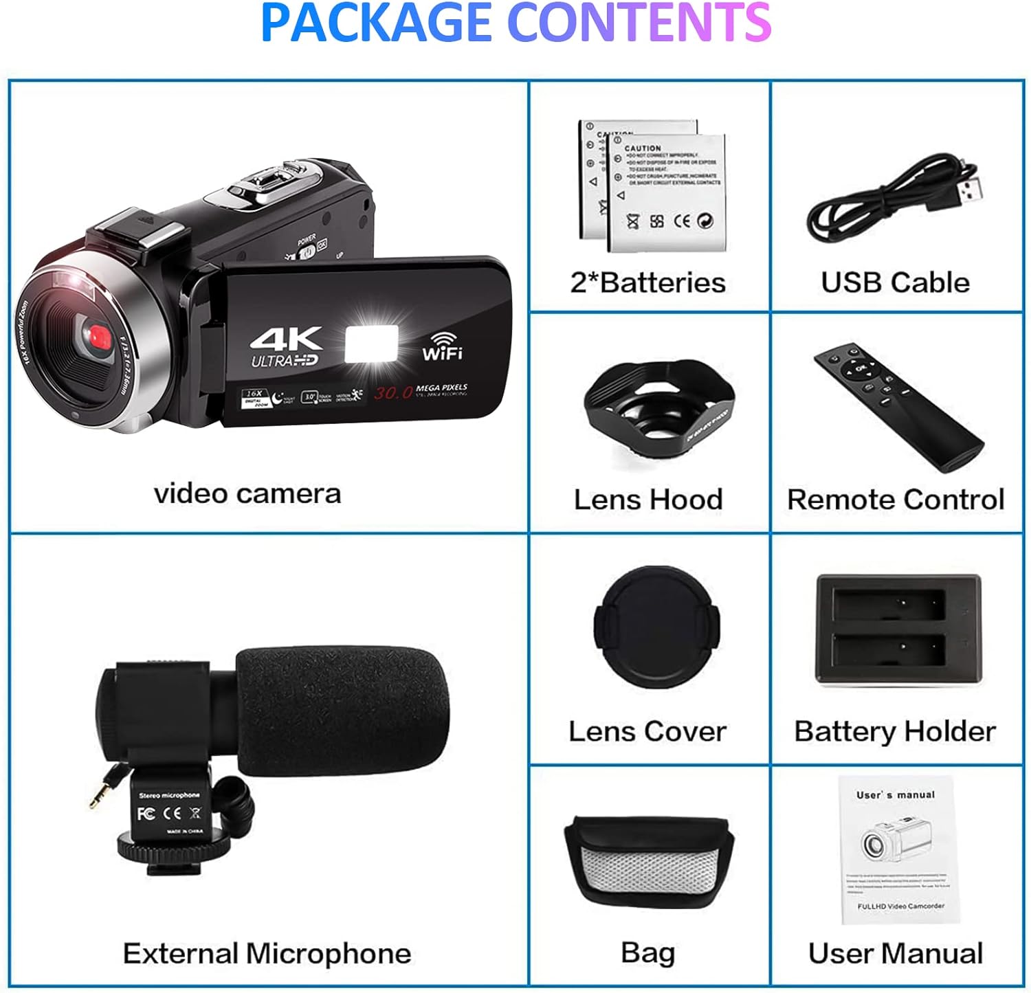 If you’re a total beginner, or you’re looking for a gift for someone wanting to get stuck into recording/videography, then this 4K camcorder is a relatively inexpensive, reasonably feature rich camcorder for amateur use, that let’s you get stuck into filming without needing to take out a bank loan!Firstly, if you’re hoping for something that can rival something like a RED camera or equivalent, you need to massively temper your expectations, as you’ll need to spend literally 10à the price of this unit for something that can begin to resemble more professional equipment. However, if your main intention is to just get hands-on with filming equipment, then this camcorder is a pretty solid choice, and I bought it for youngster who wanted to do exactly that, and is thoroughly chuffed now that they look the part as they annoy their parents filming everything they do..Included in the box is ALMOST everything you need to get started; you will need to purchase an SD card separately, which whilst a bit annoying, isn’t really any trouble, as there a blummin’ loads available on Amazon at a good price (just avoid the fake, cheap large storage cards, buy branded SD cards for legitimate read/write speeds and storage).Inside the box:⢠Camcorder (2160p/30fps – 720p/120fps)⢠Boom microphone⢠Lens hood⢠2 batteries (3.7V 1500mAh)⢠Carry case⢠Remote control*The actual video capture quality is fine for a total beginner or youngster, but it isn’t fantatsic, and a mid-high end smartphone will probably give you better results. However, as aforementioned, I purchased this as a gift for a youngster who wants to start making their own short movies and videos, and they seem to be loving it so far, so I can’t knock it too much if the recipient is over the moon about it!