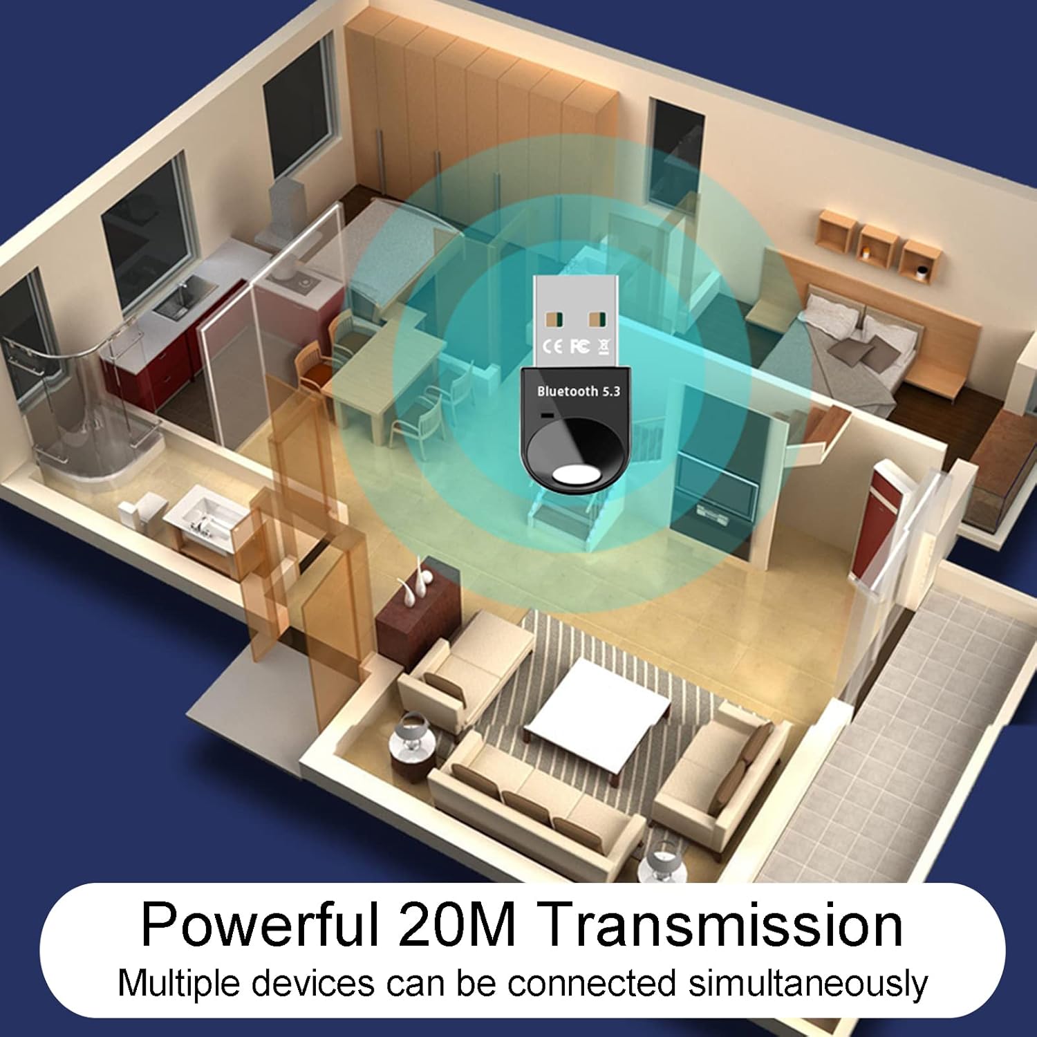 Bluetooth 5.3 adapter: Equipped with powerful Bluetooth 5.3 chip, faster and more stable transmission signal, built-in antenna design for 20 meters barrier-free signal transmission range, stable and smooth connection; Backward compatible with Bluetooth 5.0/4.0/3.0/2.0 version.