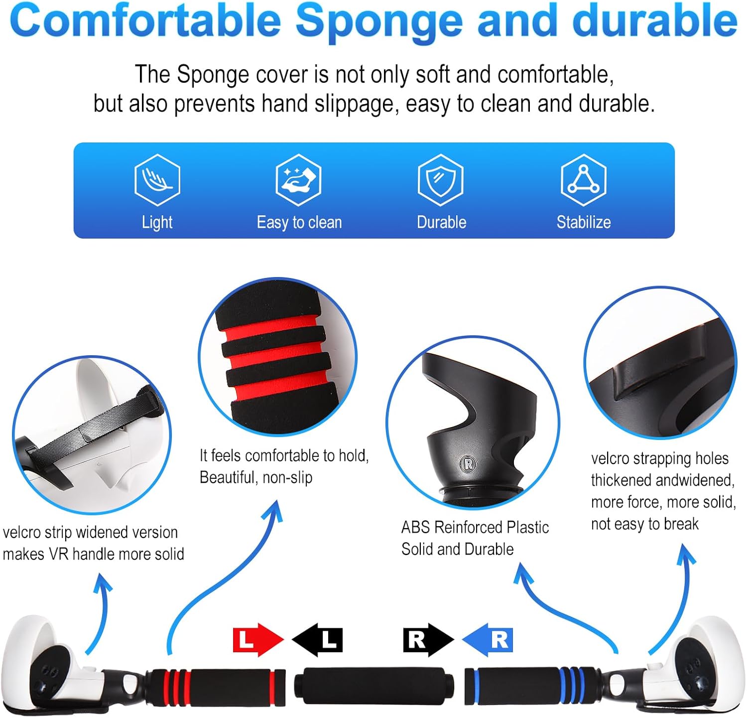 Sturdy and Durable:ABS Reinforced Plastic Shell,The part connecting the VR controller is made of high-quality reinforced ABS plastic,strong and durable, The controller is securely locked in place by a cord with Velcro to avoid the controller slipping off,Weighs only 100 grams;