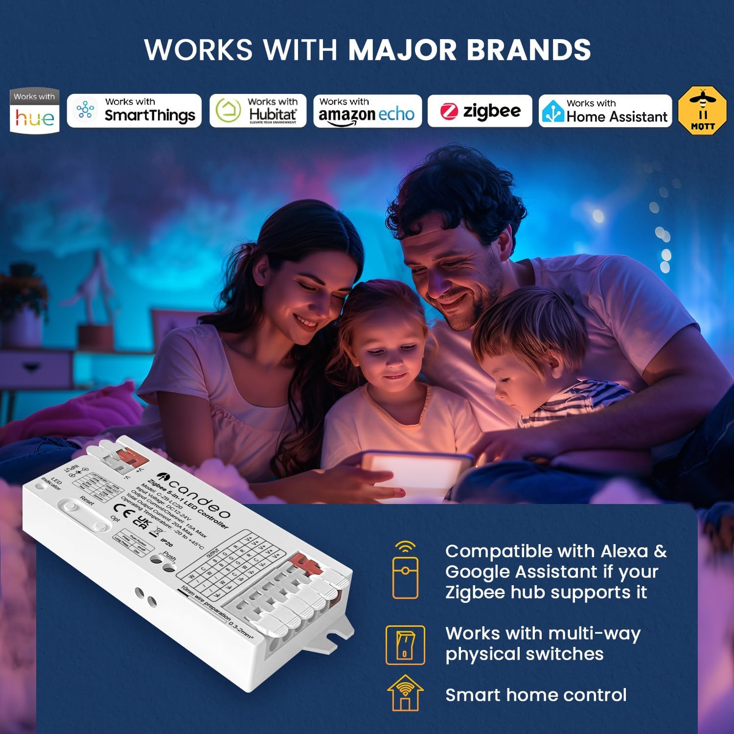 The only smart LED strip controller you will ever need. We have tried and tested many of these devices over the years, but this one beats all of them. The fact that it works with every LED strip type (except pixel strip which requires a specialised controller) is already enough to make it superior.Being able to select which mode the controller uses is a nice feature, as it only displays the attributes of the mode you have selected as to not cause confusion. We use this device in Home Assistant, and setting the mode to RBG will only display the RGB controls within Home Assistant, but if we change the mode to CCT, it will only show colour temperature controls instead. This means you don’t have to worry about compatibility. Pair this with the fact you can install the controller without tools thanks to the clip style connectors, and you’ve got yourself a well built product that is easy to use.Overall, this is a high quality product that I would recommend to everyone looking into smart LED strip.