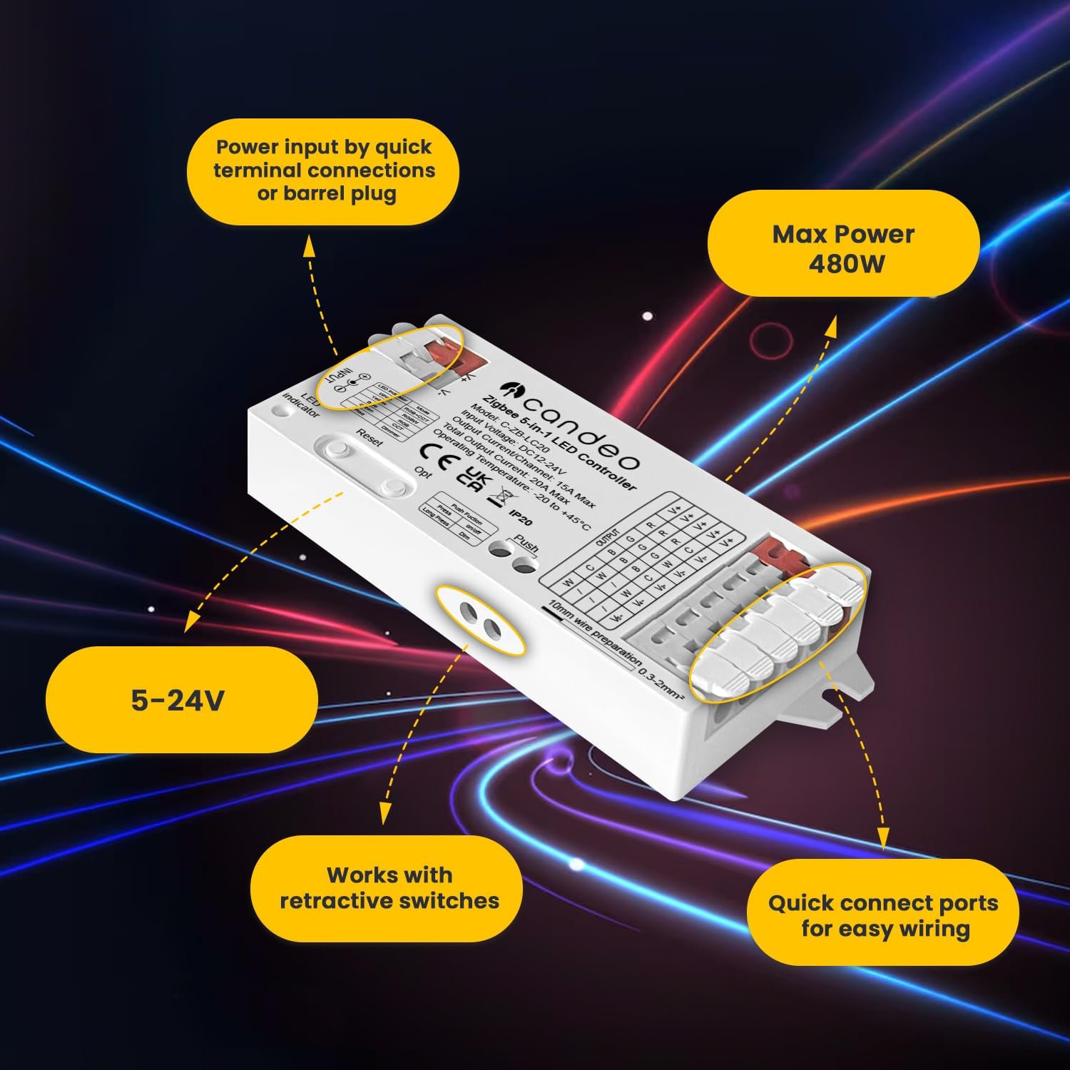 HIGH POWER OUTPUT: Handles up to 20A total current, ideal for extensive LED strip installations and dynamic lighting effects with reliable brightness.