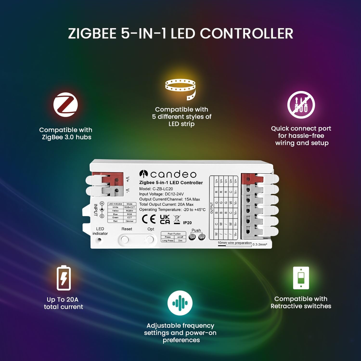 ZigBee LED Strip Controller – Compatible with Home Assistant, Hubitat, Philips Hue and Other zigbee hubs – 5-in-1 for RGBWW, RGBW, RGB, CCT, and Single-Colour LED Strips