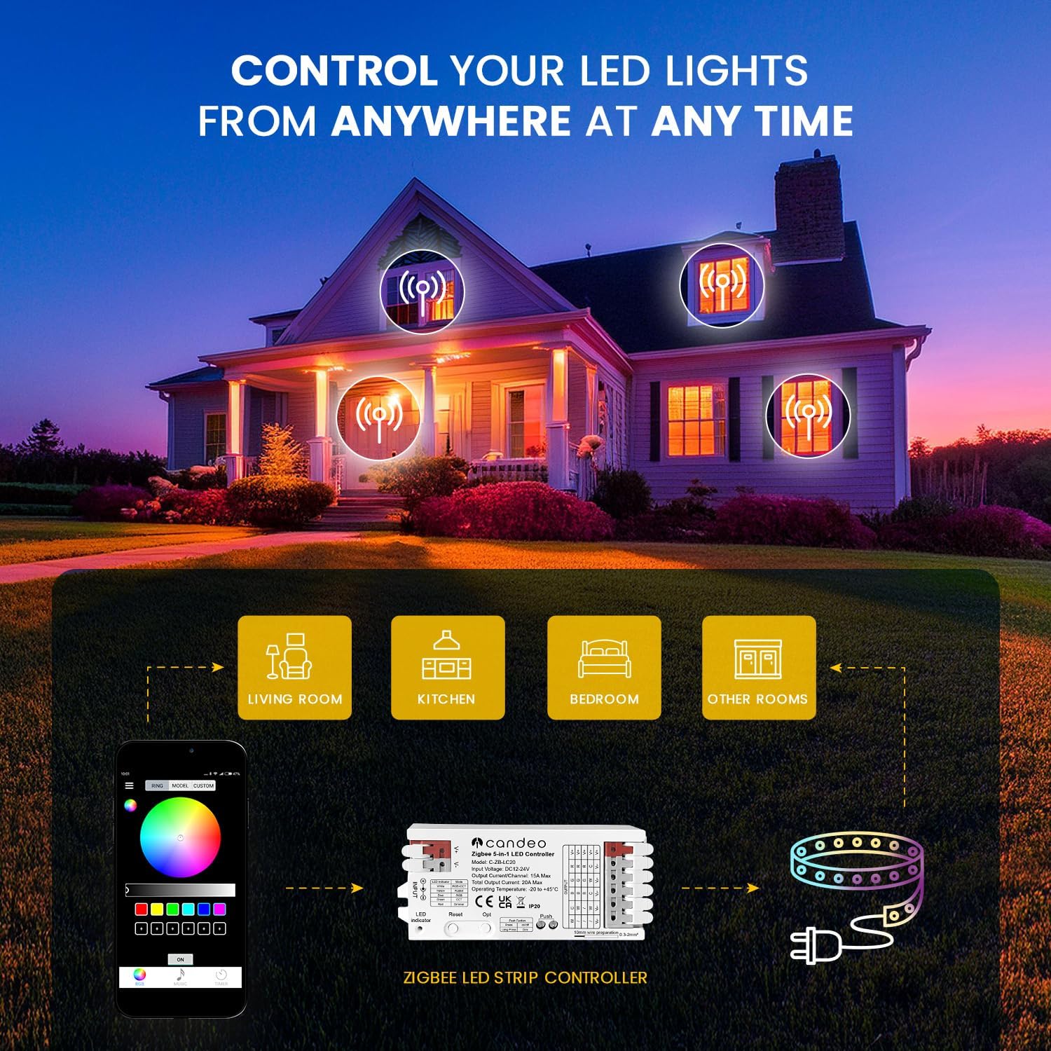 5-IN-1 LED COMPATIBILITY: Controls RGB, RGBW, RGBWW, CCT, and single-color LED strips, perfect for accent lighting, gaming setups, home décor, lights and mood lighting.