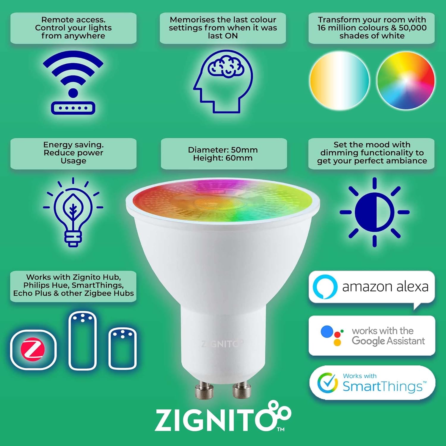 8 reviews for ZIGNITO GU10 Smart Bulb, White & Colour LED, Works with, Alexa, Hey Google, S’Things (Hub Required) Zigbee GU10, Smart Spotlight, Up to 16 Million hue of Colours and Whites. (Pack of 4)