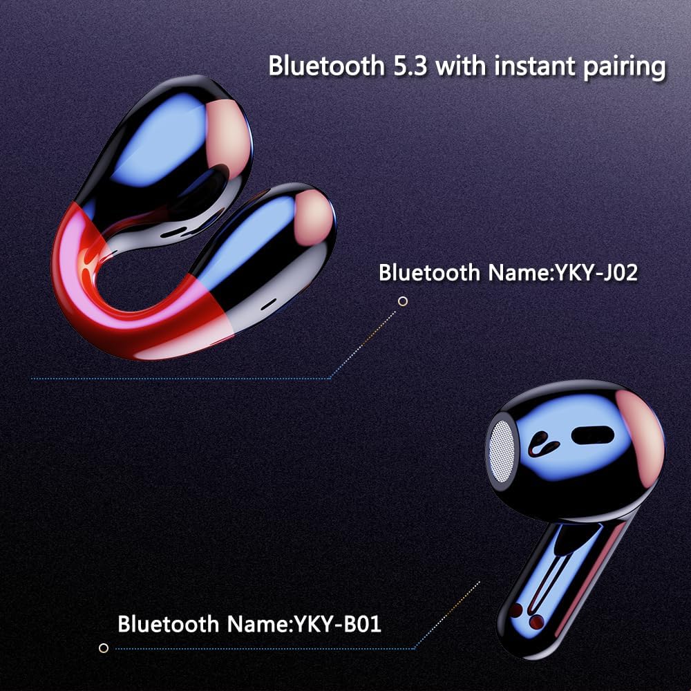 Dual-Set Design for Versatile Listening: These open ear headphones come with two distinct sets of earphones: the in-ear wireless earbuds (Bluetooth name: YKY-B01) and the clip on ear buds wireless earbuds (Bluetooth name: YKY-J02). This unique design allows two people to use different sets of Bluetooth earphones simultaneously, making it perfect for couples or sharing with friends. Switch between the two styles to match your preference, ensuring ultimate comfort and flexibility.